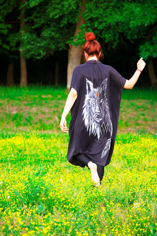 Camasa-Rochie neagra cu design unicat, pictura "Wolf"
