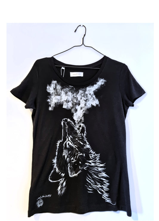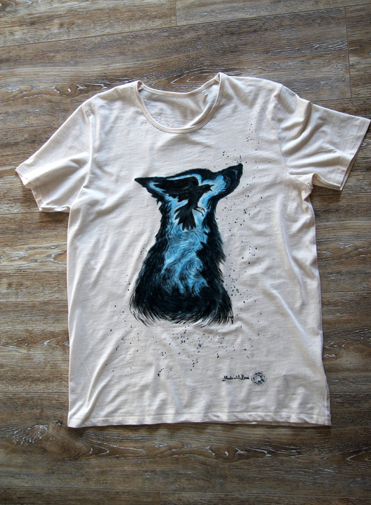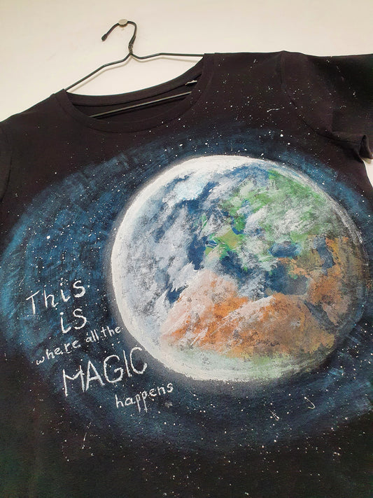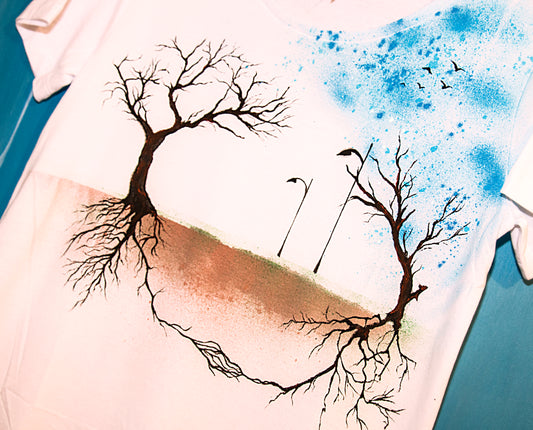Tricouri negre din bumbac organic, pictate manual cu acrilice pentru textile