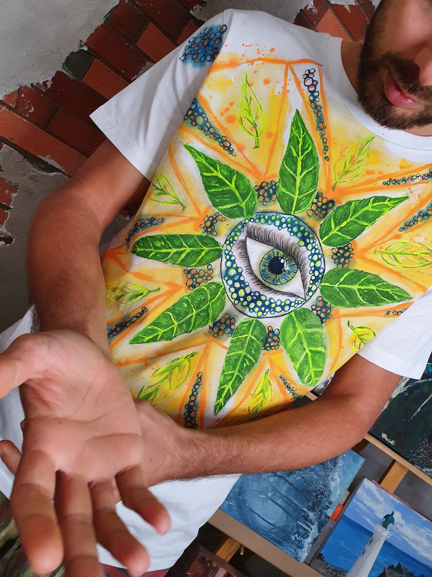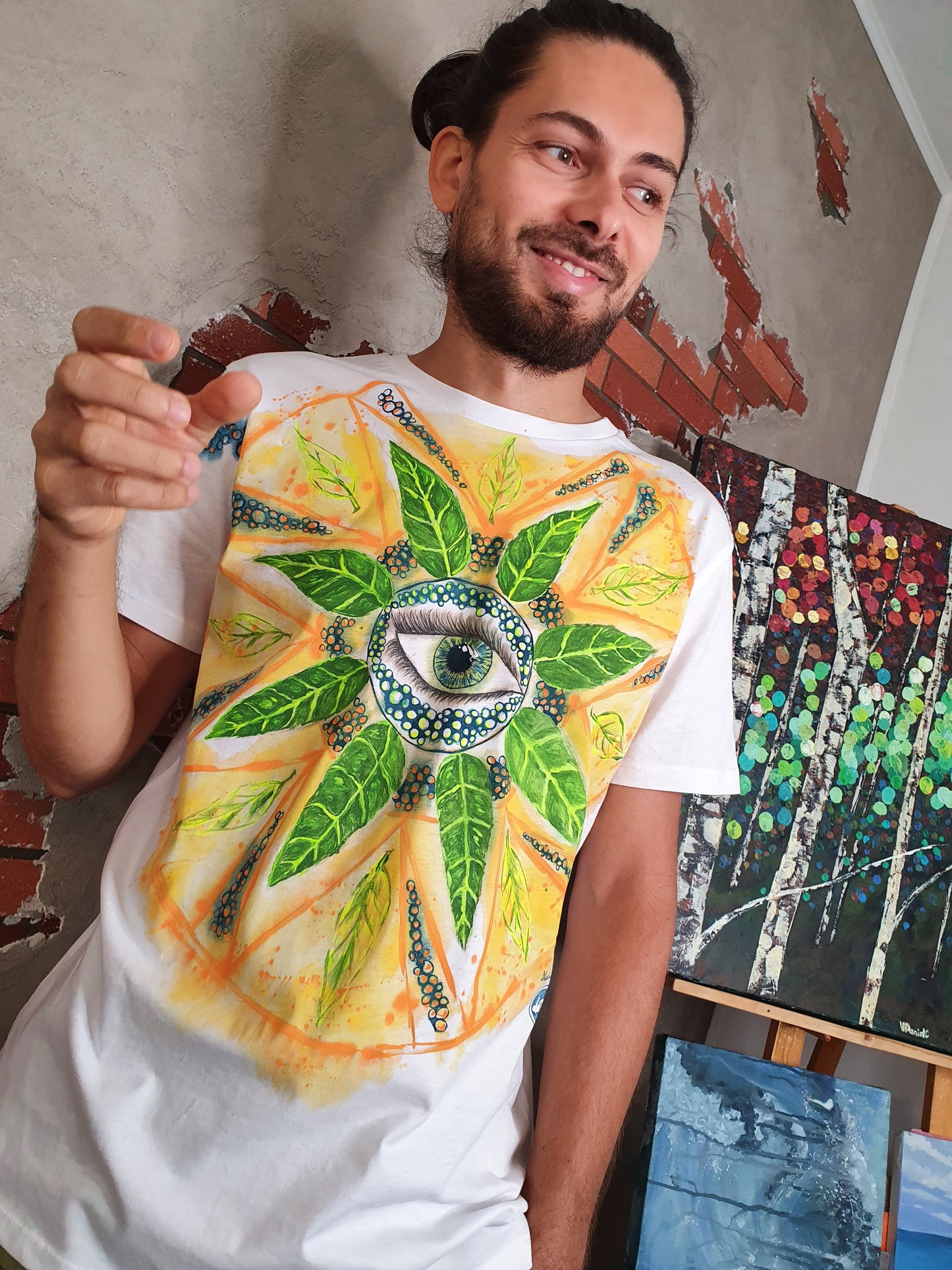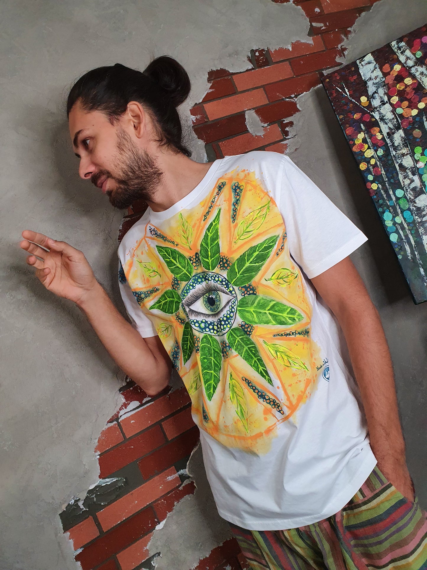 Tricou din bumbac organic, pictat manual cu acrilice dedicate pentru tesaturi